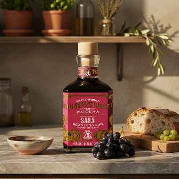Balsamic vinegar is a dark, syrupy vinegar originating from Italy. It is made from freshly crushed grape juice, known as "must," that is aged in wooden barrels.