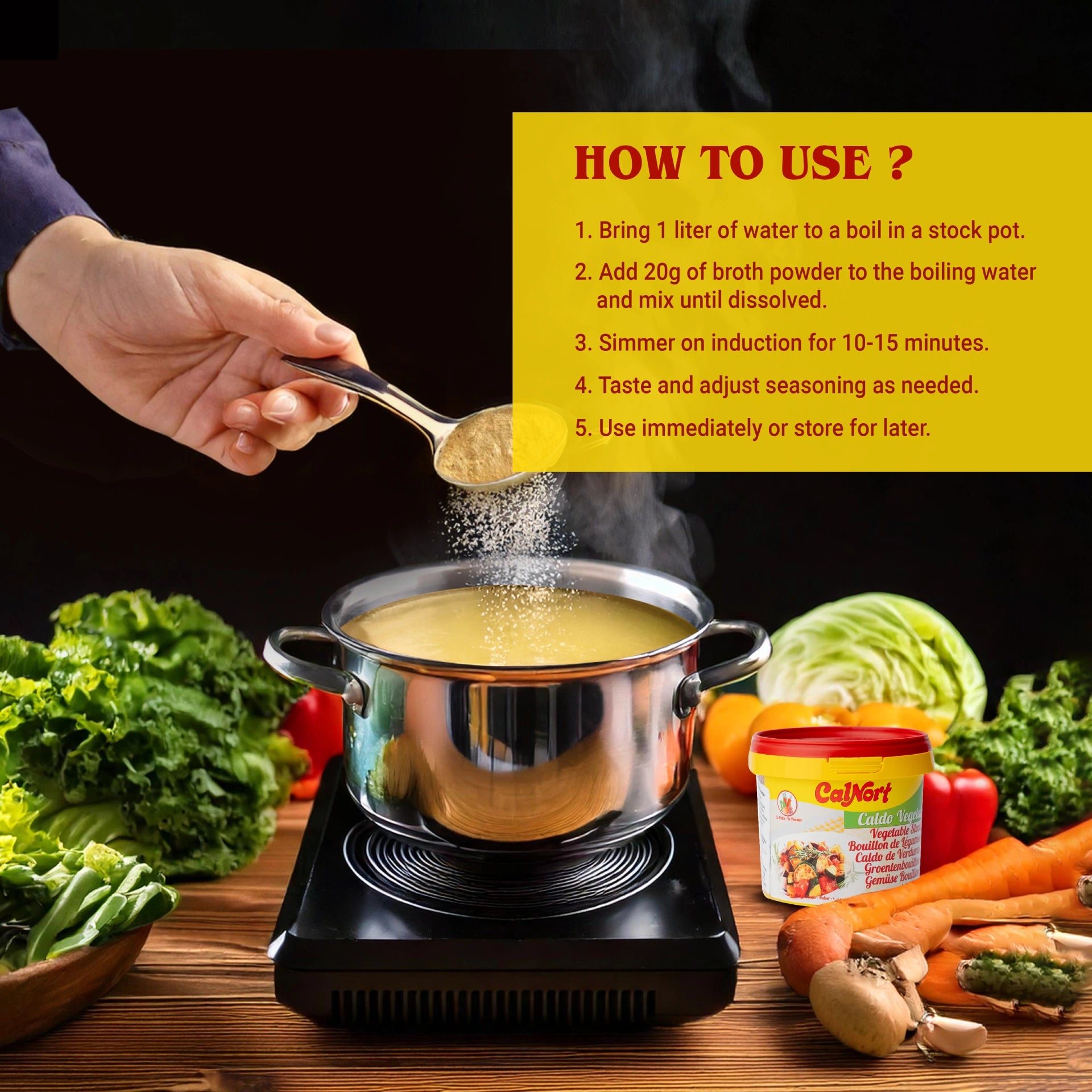 Calnort Vegetable Bouillon, made in Burgos, Spain since the 1970s, is a high-quality, plant-based bouillon that enhances your dishes with a rich vegetable essence. Whether you're using it as vegetable broth, vegetable powder, or vegetable bouillon powder, it adds a delicious depth of flavor to soups, stews, sauces, and risottos.