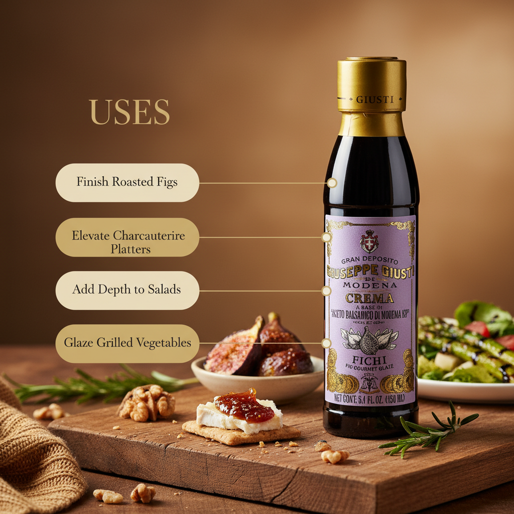 Introducing Giusti’s Fig Gourmet Glaze with Balsamic Vinegar of Modena from Acetaia Giusti: a versatile and delicate cream featuring subtle fruity and sweet notes of fig. Crafted with a blend of Balsamic Vinegar of Modena, cooked grape must, glucose and fructose syrup, fig juice and puree, and modified corn starch, this glaze presents a truly unique flavor profile.