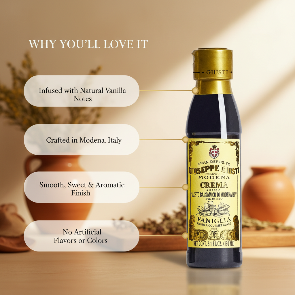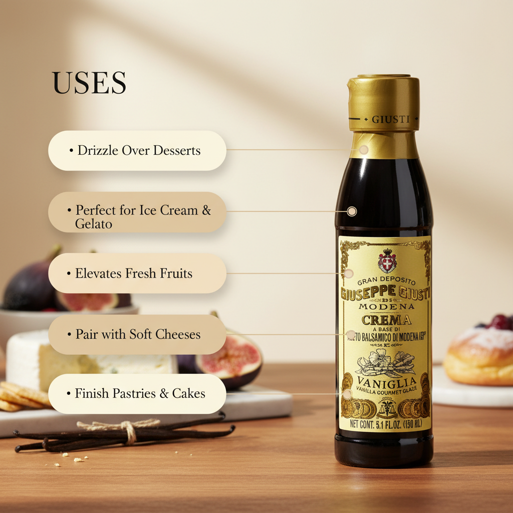 The Glaze with Balsamic Vinegar of Modena and vanilla elevates culinary creations with its luxurious flavor profile. Perfect for salads, roasted vegetables, meats, and desserts, it adds sophistication to any dish. Additionally, it serves as a versatile glaze for grilled meats or seafood and enhances appetizers and desserts with a finishing touch.