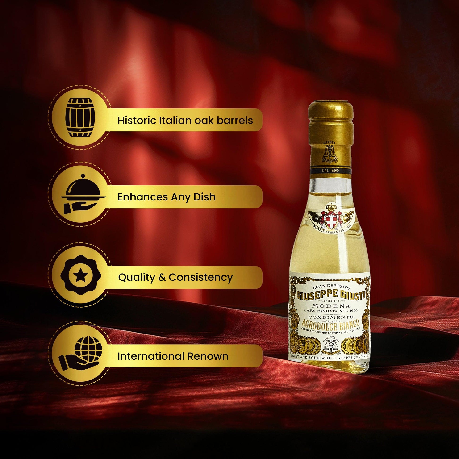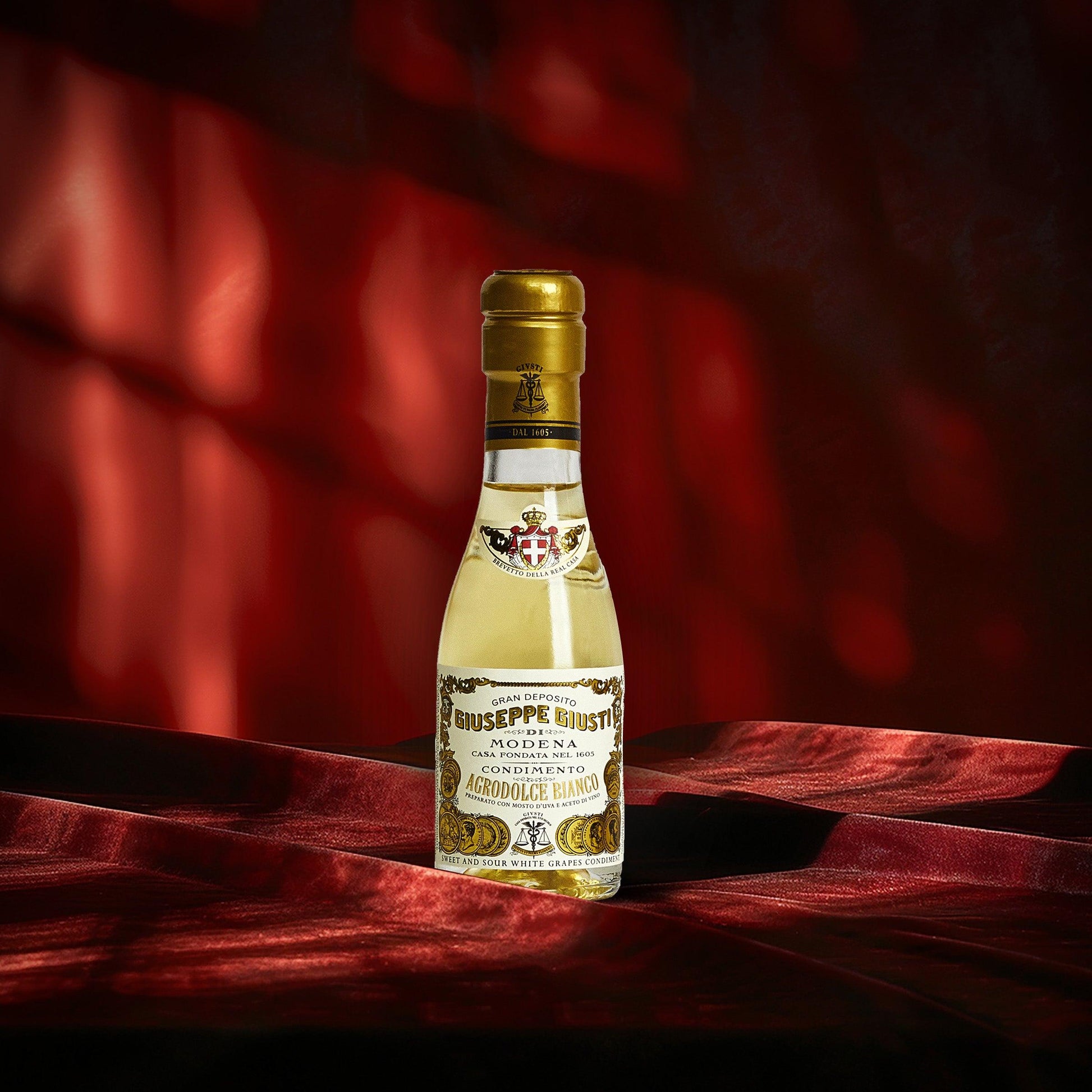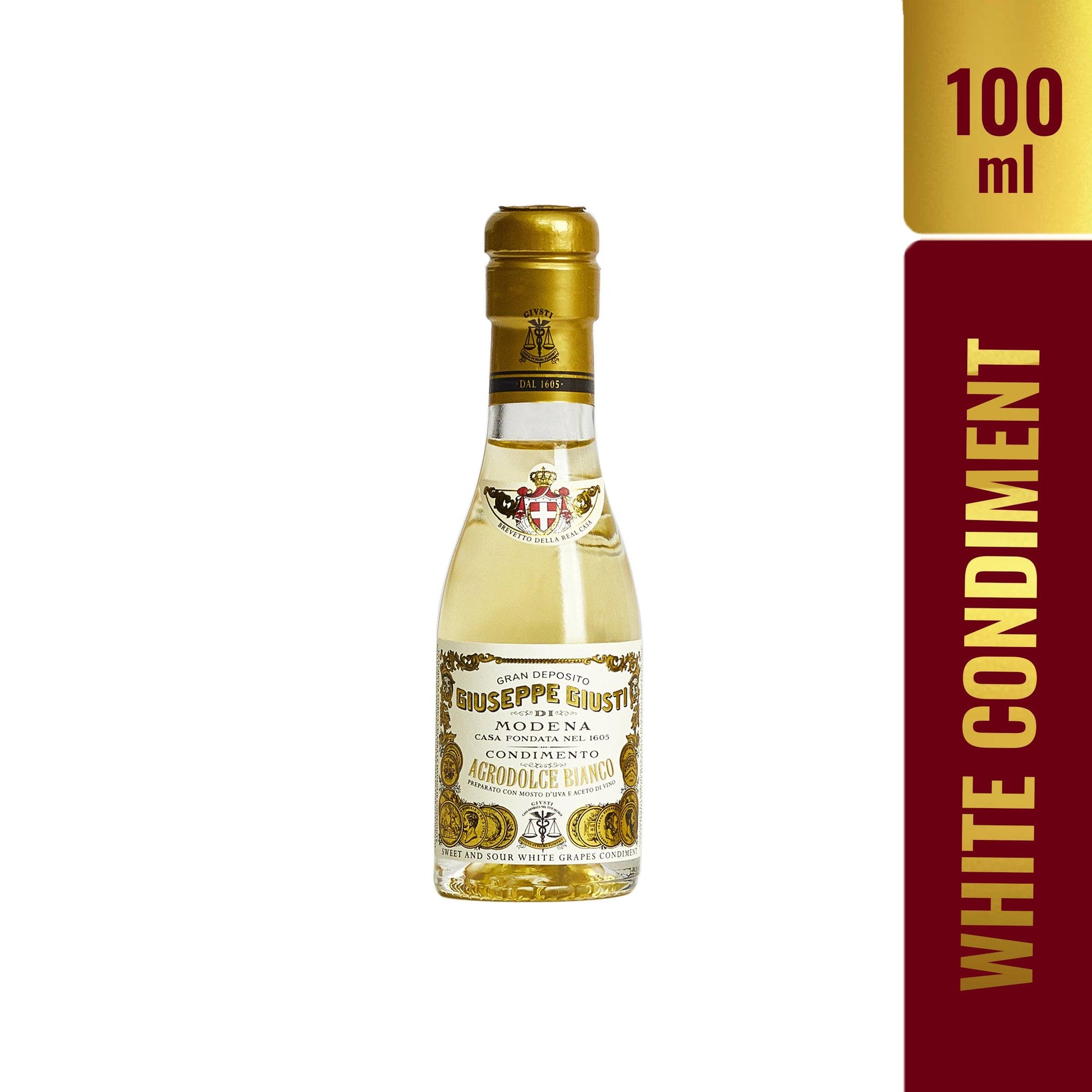 Combining the sweet essence of Trebbiano grape juice with premium white wine vinegars and aged in French oak and ash barrels, the Giusti White Condiment - Champagnottina boasts a complex and sophisticated flavor profile, perfect for enhancing any meal.