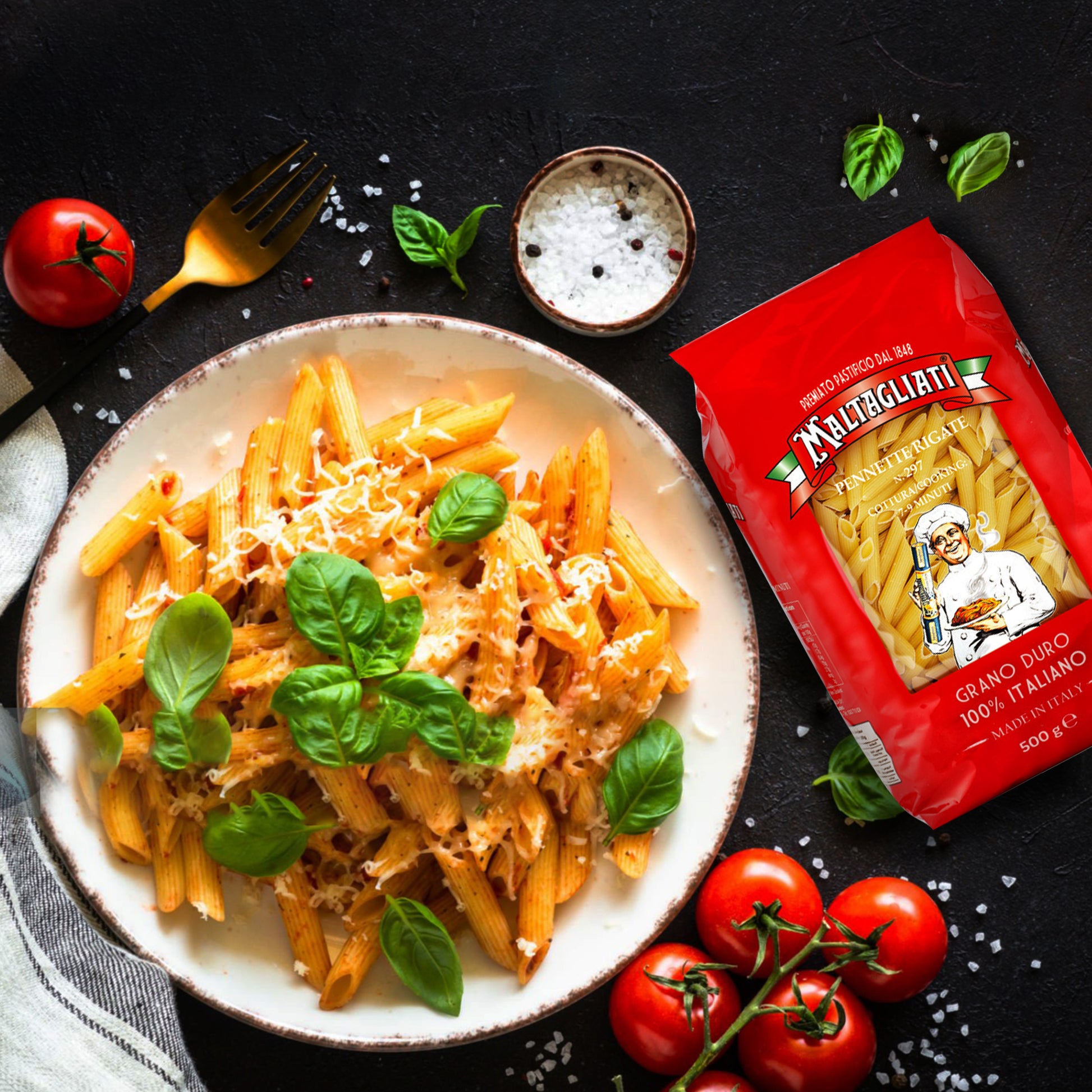 Maltagliati Penne Rigate Pasta features a unique ridged shape that enhances sauce adherence, ensuring every bite is flavorful. Made from 100% durum wheat semolina, it is rich in protein, ensuring purity and quality in every bite. This pasta is proudly present in over 50 countries, showcasing its global appeal.