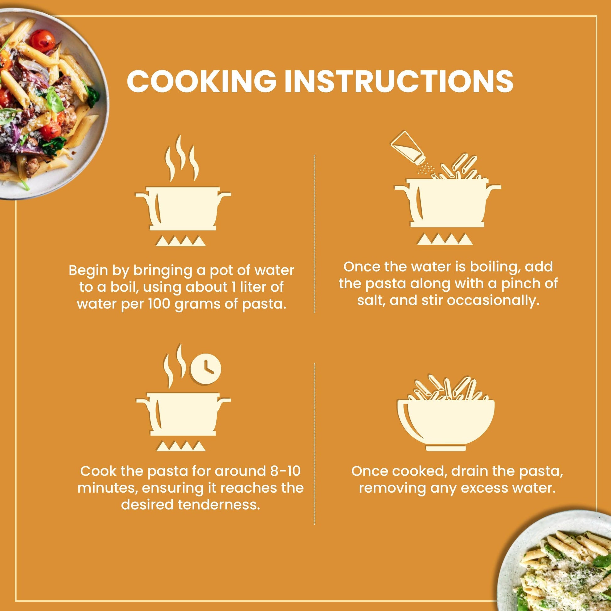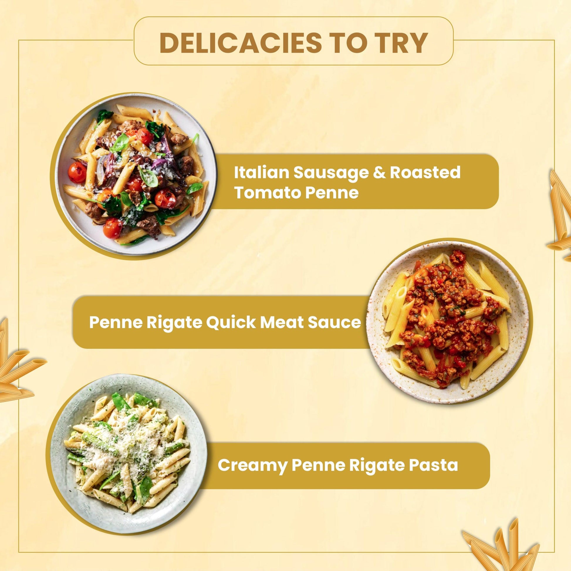 Immerse yourself in the exceptional features of Penne Rigate. Made from the finest High-Quality Durum Wheat and carefully bronze-cut, each piece tells a story of quality. The distinctive ridges and angular cuts of Penne Rigate serve as perfect sauce pockets, ensuring every bite is a fusion of taste and texture.