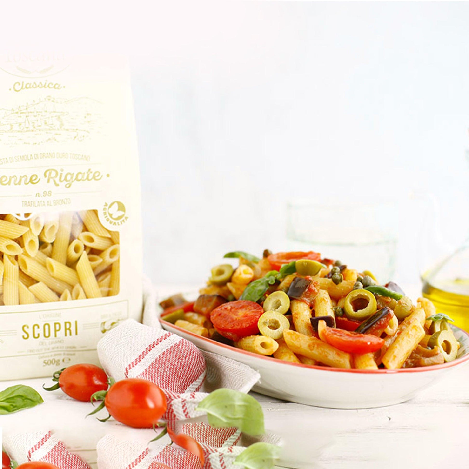 Indulge in Penne Rigate's authenticity, crafted to perfection. With its 100% biodegradable packaging, you're not just savoring pasta; you're embracing sustainability. Add a sprinkle of fresh herbs, seasonal vegetables, and a drizzle of extra virgin olive oil to unlock the full potential of every mouthful. Picture the source of Penne Rigate's essence – the sun-drenched fields and pure springs of Tuscany. These elements infuse our pasta with a sense of place and purpose, where traditional crafting techniques meet modern dedication. Letting the magic of Pasta Toscana elevate your dishes to new heights, one perfectly ridged piece at a time.