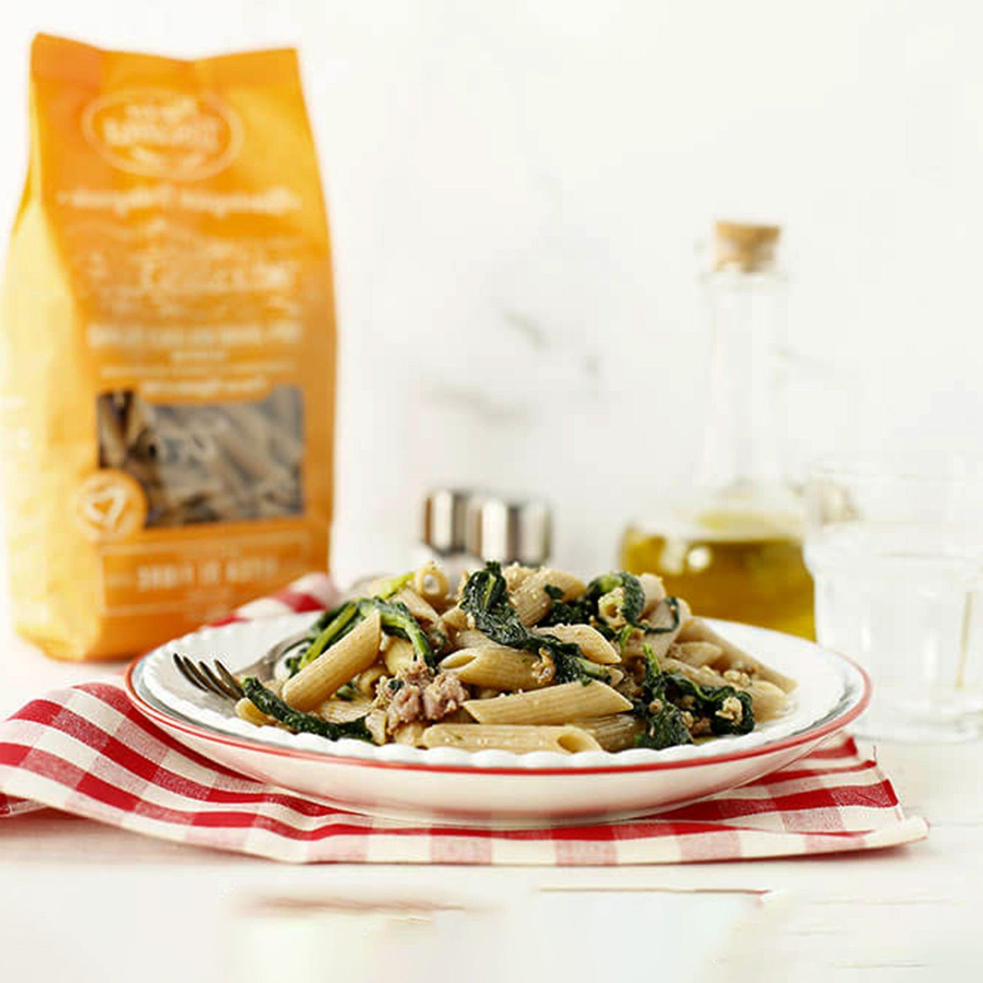 Created entirely from 100% organic high-quality durum whole wheat and pure water, this pasta is a testament to nature's bounty. Infused with Omega-3 from flaxseed flour cultivated in Tuscany, each piece is bronze-drawn and dried at low temperatures, ensuring a distinctive flavor and a textured surface that cradles sauces beautifully.