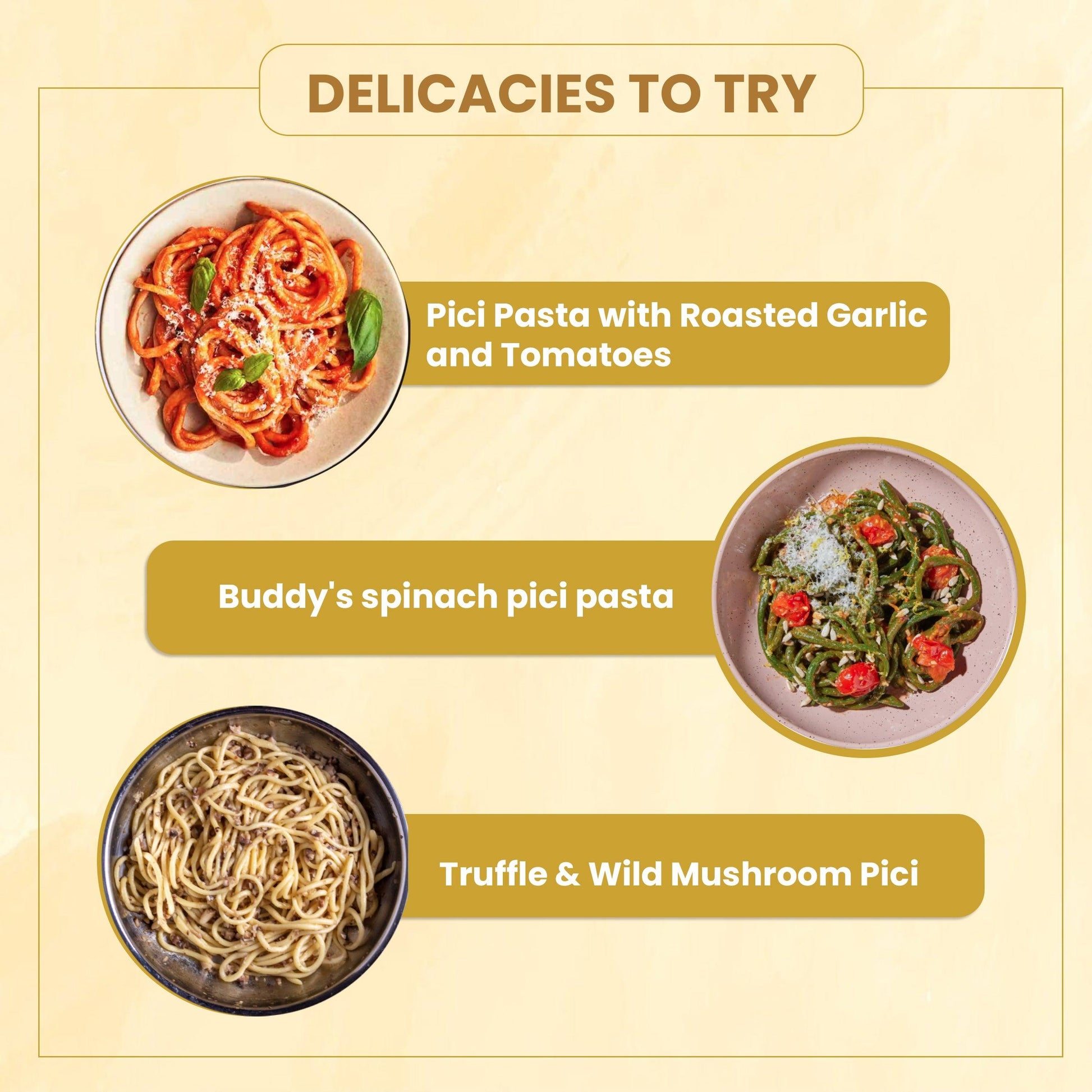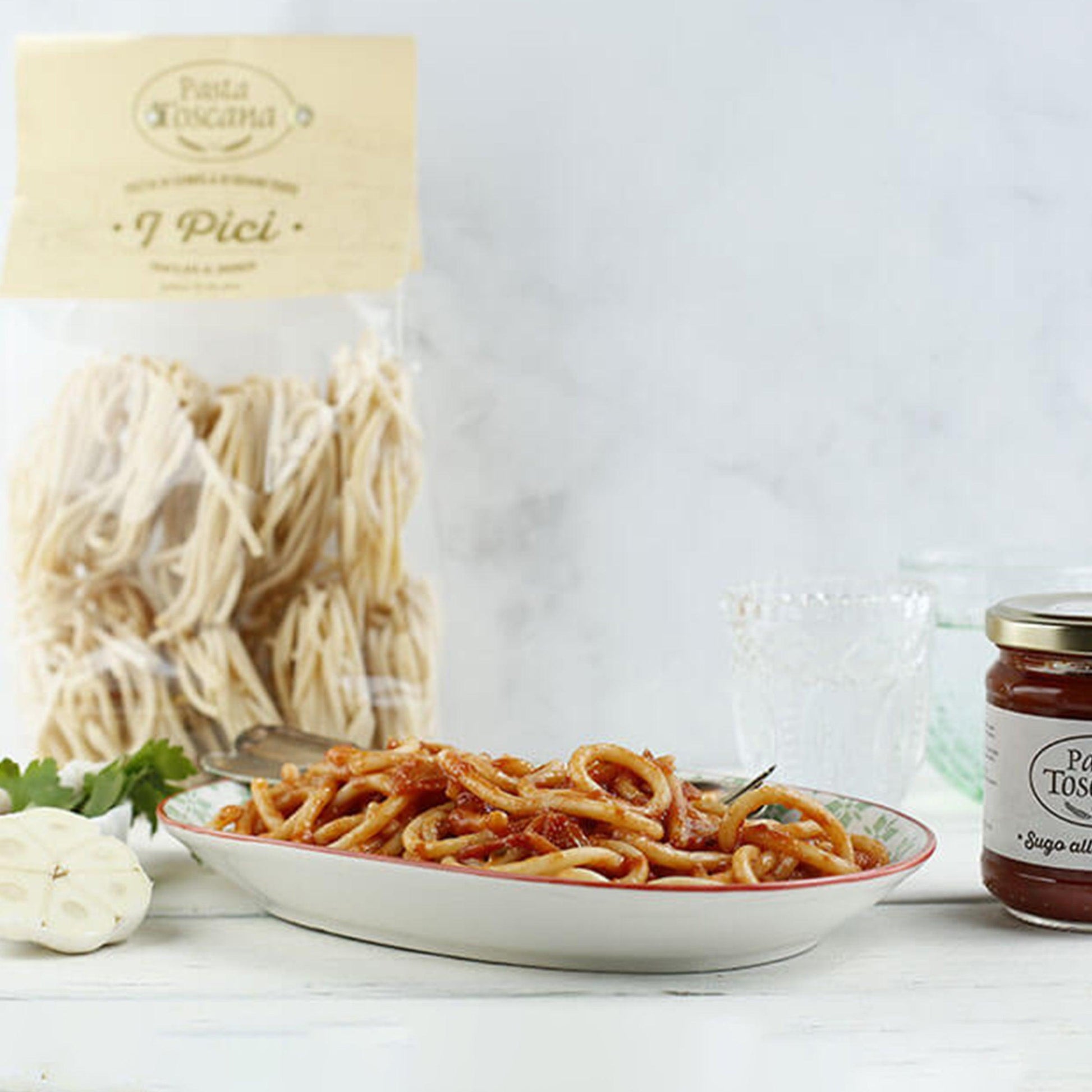 Pici invites you to embrace culinary creativity. Whether you're creating traditional dishes or experimenting with contemporary flavors, this pasta's versatility shines. From rich ragù to vibrant pesto, Pici elevates every recipe to a masterpiece.