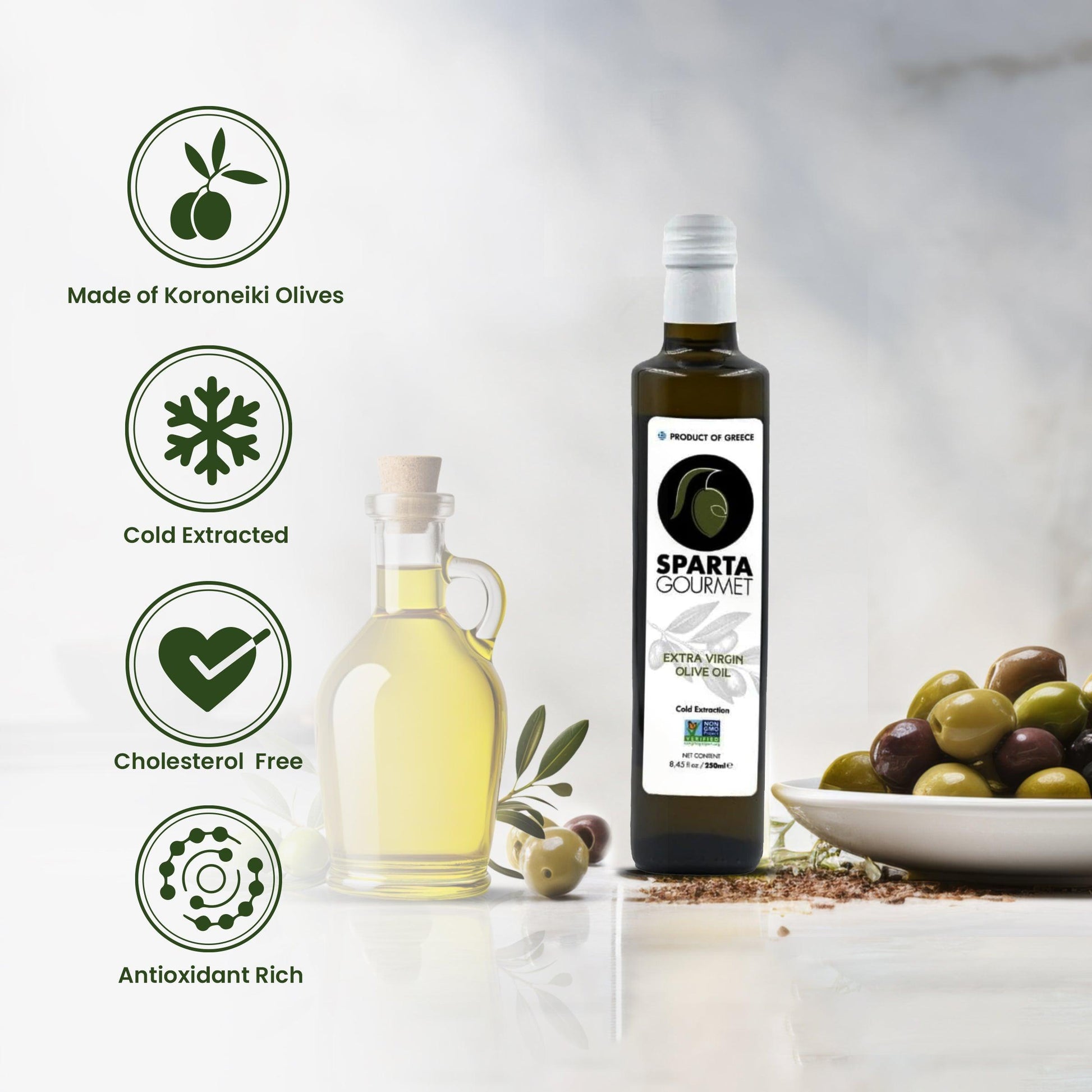 Immerse yourself in the health benefits of Extra Virgin Olive Oil, known for its heart-healthy properties and antioxidant-rich composition. Embrace the taste of Greece while nourishing your well-being.